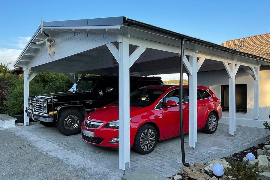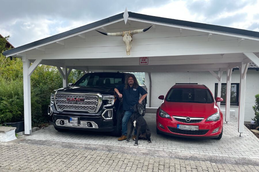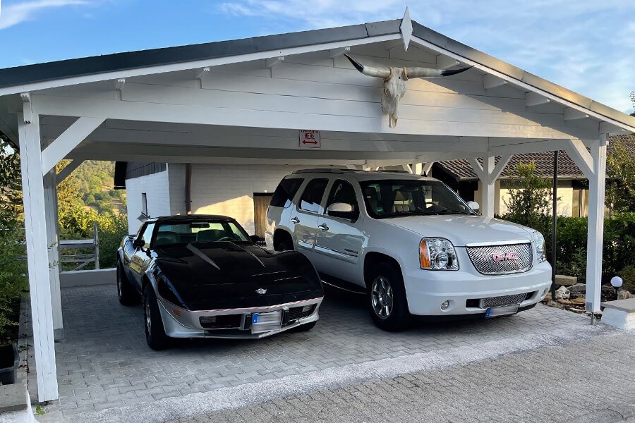 Vår kund Manfred, en oberoende försäkringsförsäljare, har tillsammans med sin fru och deras charmiga grand danois skapat sin lilla amerikanska oas mitt i Tyskland, i den pittoreska staden Röttingen. Manfred har berättat för oss att han är mycket passionerad när det gäller amerikanska fordon och att han behövde rätt produkt för att förvara dem säkert på sin tomt. Kvalitetsfordon förtjänar kvalitetslösningar – när idén väl kom, började sökandet. Efter noggrann research av olika modeller på internet stack Double wooden carport CLASSIC från Pineca.se omedelbart ut: